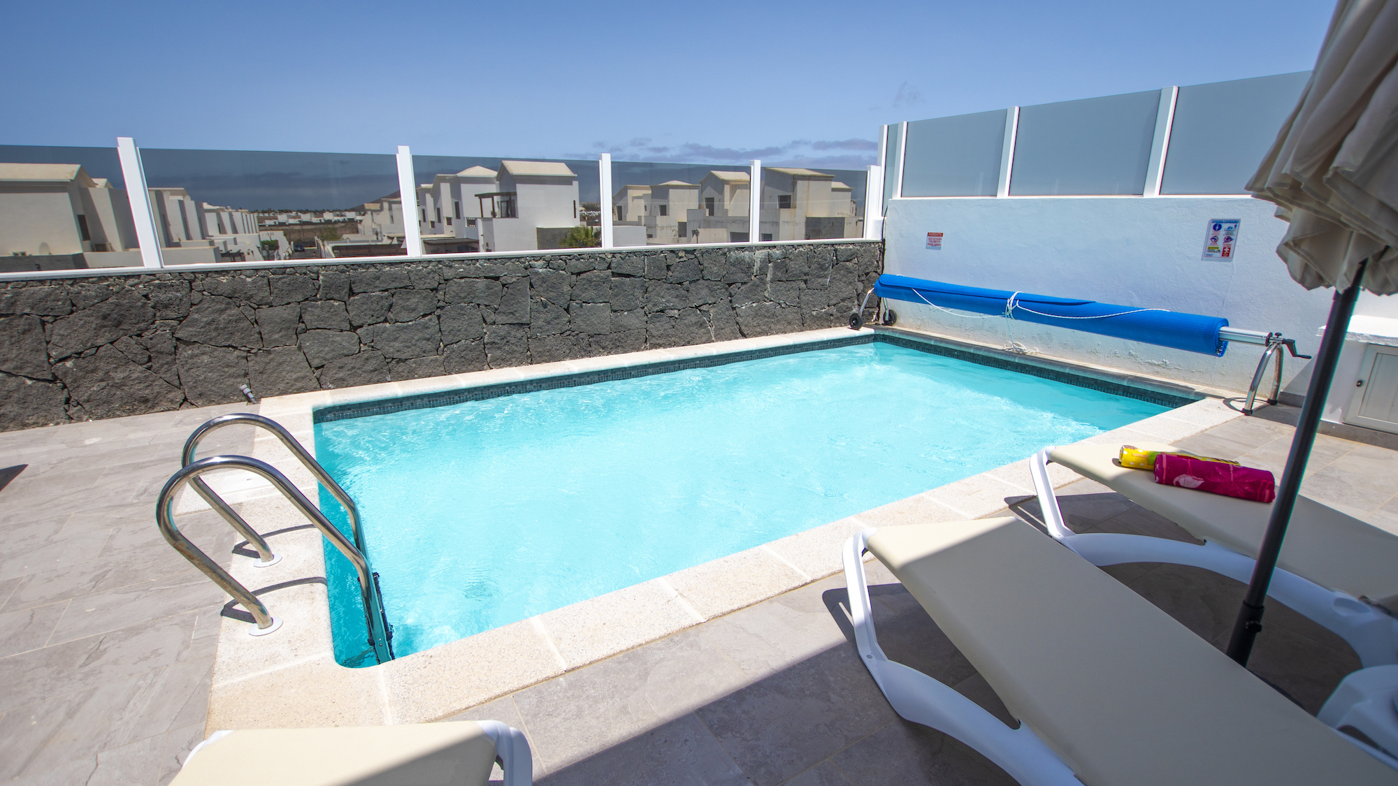 Outside, guests can enjoy partial sea views across the ocean towards the Marina. The electrically heated 7 x 3.5 metre saltwater swimming pool, accessed by ladder steps, is perfect for year-round use. A high-quality jacuzzi hot tub provides a wonderful place to relax and soak up the warm Lanzarote climate. Pool towels are provided for added convenience.