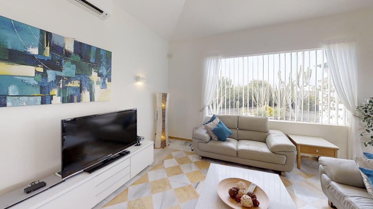 Inside, the villa is spacious, stylish, and has cool marble floors throughout. The open-plan lounge is comfortably furnished with leather sofas and opens directly onto the terrace through double patio doors. Entertainment is well catered for with the internet TV system, featuring British TV, films, sports and more.